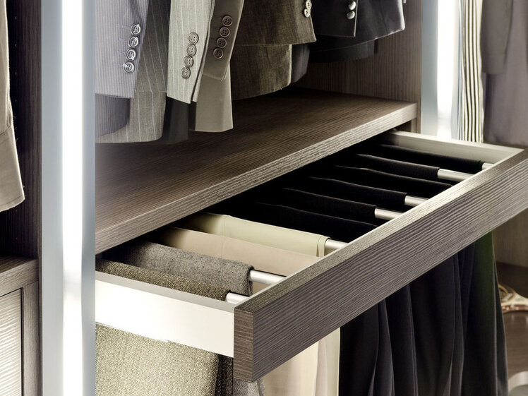 L'éclairage est l'un des facteurs les plus importants lorsqu'il s'agit de créer un environnement parfait. Avec une penderie sur mesure, vous pouvez intégrer différents types d'éclairage dans l'armoire. L'éclairage vous permet de trouver plus facilement vos vêtements et améliore en outre votre confort de vie - votre penderie devient une expérience.