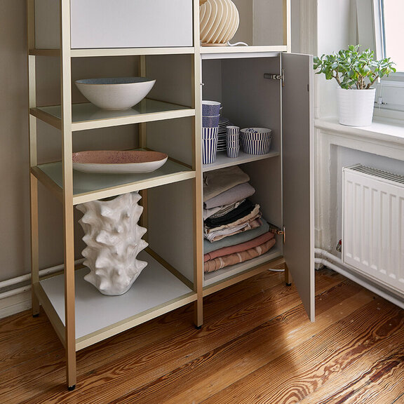 Le système d'étagères peut être complété par des éléments supplémentaires tels que des tiroirs ou des portes battantes afin de répondre à vos besoins. De cette manière, le système d'étagères Creo peut être utilisé non seulement comme surface de rangement ouverte, mais aussi comme armoire ou bureau fermé.