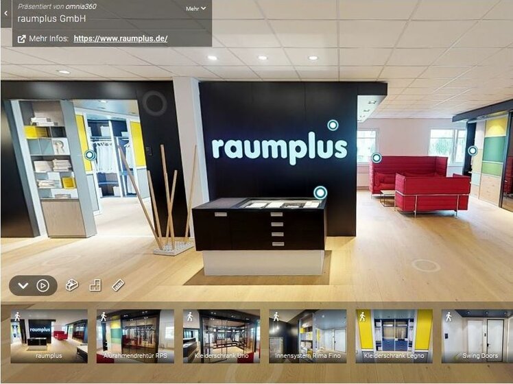 Mais que faire si le déplacement chez le revendeur n'est pas immédiatement réalisable ? Même dans ce cas, il est possible de planifier un dressing sans devoir renoncer à une assistance. Ainsi, raumplus.de propose un showroom à 360° qui permet de faire une visite virtuelle d'une salle d'exposition raumplus. Un simple clic de souris permet de faire le tour des différentes zones. On y voit tout ce que propose l'univers raumplus, du rangement aux différents systèmes de portes coulissantes, en passant par les portes battantes et les variantes d'éclairage. Ce qui est bien dans ce type de présentation, c'est non seulement qu'on y trouve de nombreuses inspirations pour les armoires, mais aussi qu'on peut se laisser guider vers des informations plus détaillées à différents points. Le showroom 360° devient ainsi une première source d'inspiration variée lorsque le projet "concevoir un dressing" débute.